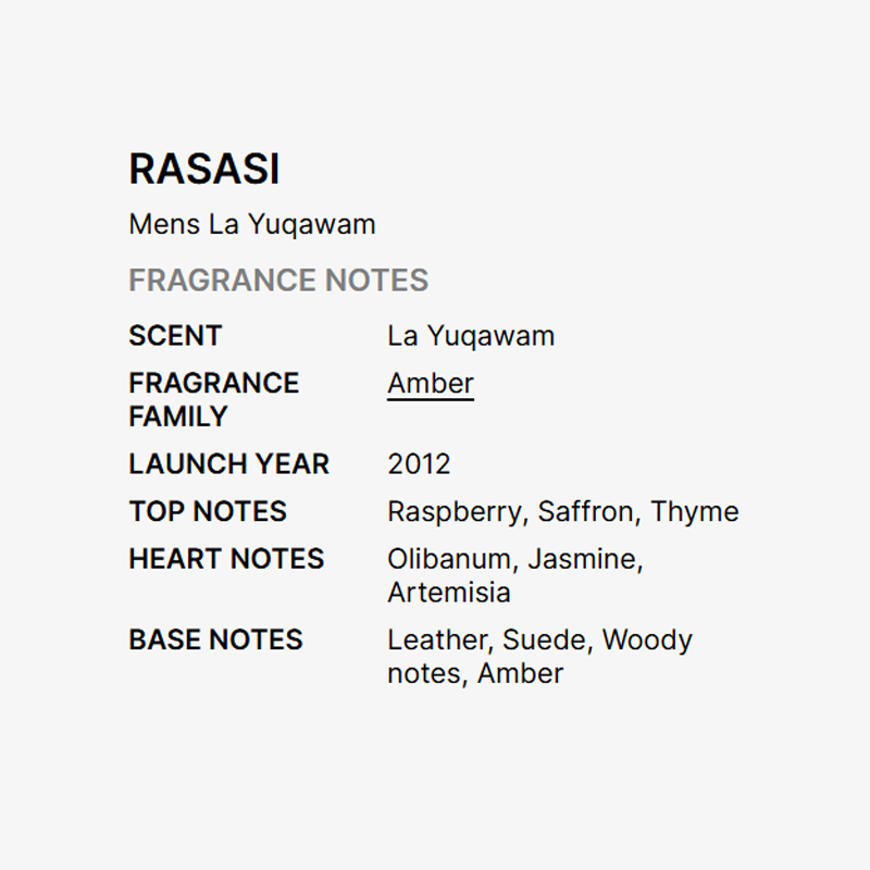 La Yuqawam opens with a captivating burst of raspberry, saffron, and thyme—an unexpected trio that delivers a fresh yet spicy introduction. These top notes are designed to spark intrigue and leave a memorable first impression. As the scent develops, heart notes of olibanum, jasmine, and artemisia unfold, adding a smooth, aromatic richness that deepens the experience and enhances its allure.