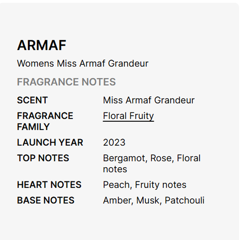 Miss Armaf Grandeur opens with the fresh and invigorating top notes of bergamot, rose, and other floral nuances. As the fragrance unfolds, the heart notes of juicy peach and enticing fruity accords add a touch of sweetness, creating a harmonious balance. Finally, the base notes of amber, musk, and patchouli provide a warm and lasting finish, leaving a memorable impression.