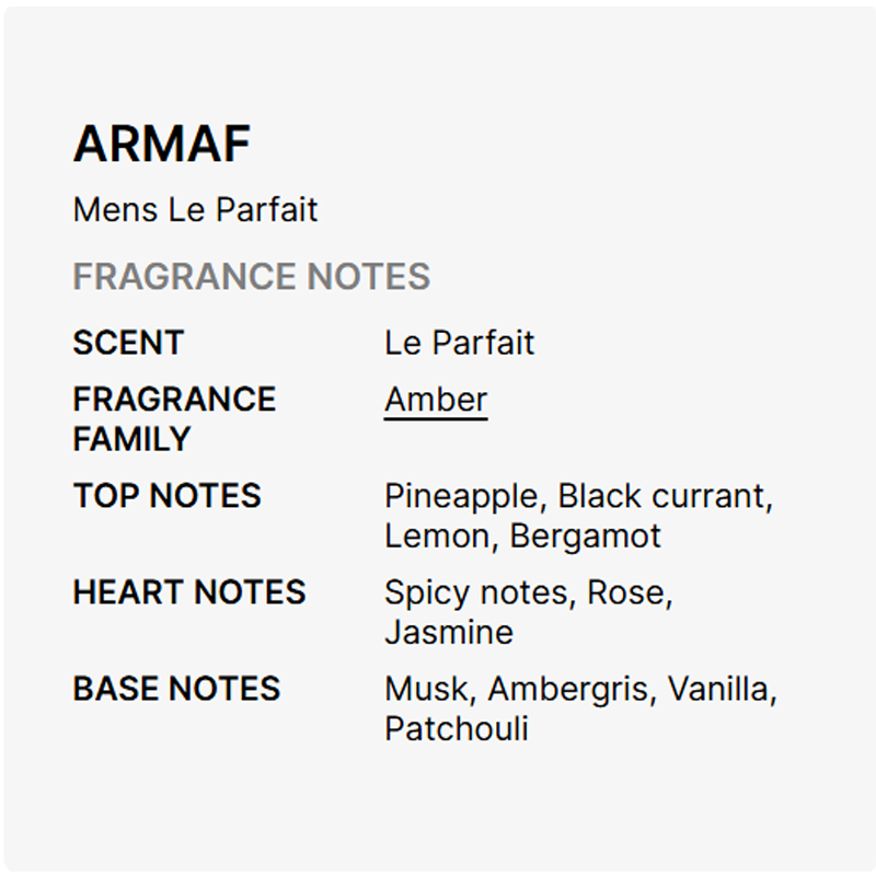 Introducing the captivating men’s fragrance Le Parfait by Armaf, a renowned design house for unique scents. It’s a woody spicy fragrance that elegantly combines the boldness of grapefruit, lemon, and saffron with the sophisticated blend of coffee, ginger, lavender, and sage. This remarkable scent composition is finished with a rich base of amber, cedar, and leather, adding an earthy, woody, and slightly animalic finish that captures the spirit of a modern man.