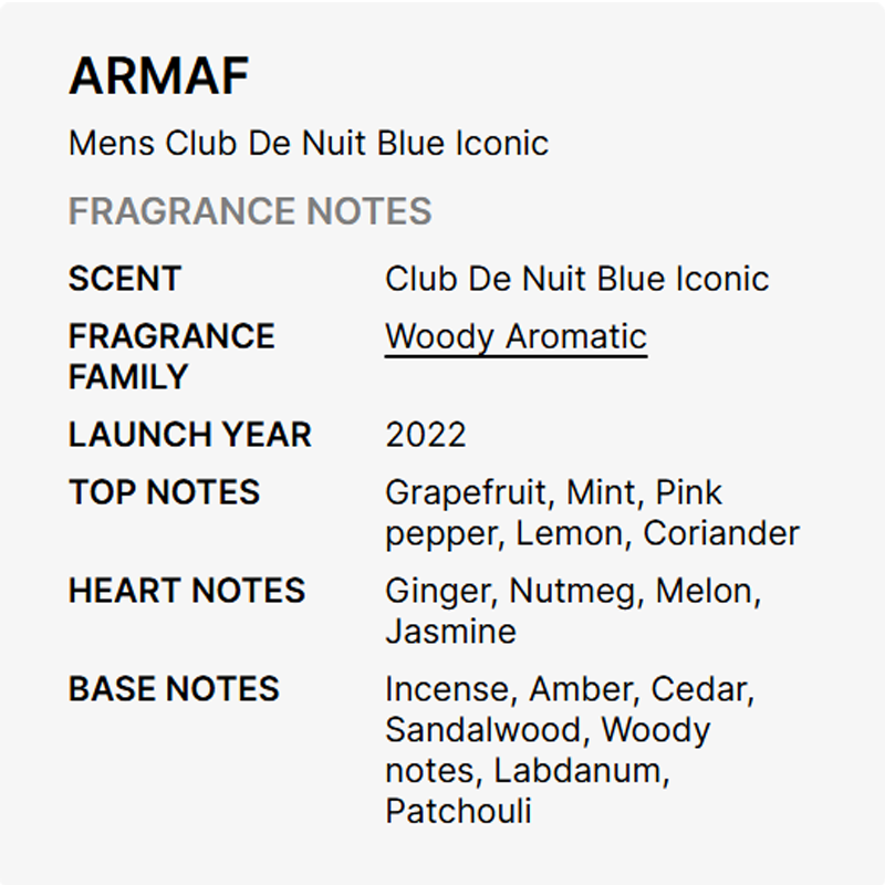 Club De Nuit Blue Iconic opens with a burst of energy, featuring top notes of zesty grapefruit, refreshing mint, spicy pink pepper, tart lemon, and warm coriander. This dynamic introduction sets the stage for a powerful fragrance journey that commands attention and leaves a lasting impression.
