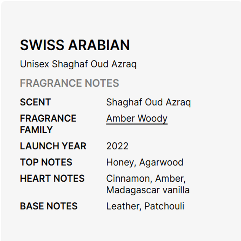 Indulge in the artistry of Swiss Arabian and embrace the luxurious warmth of Shaghaf Oud Azraq. This unisex Eau de Parfum is a celebration of boldness and refinement, crafted to leave a lasting mark wherever you go. Available for shipment only in the Contiguous United States & Canada.