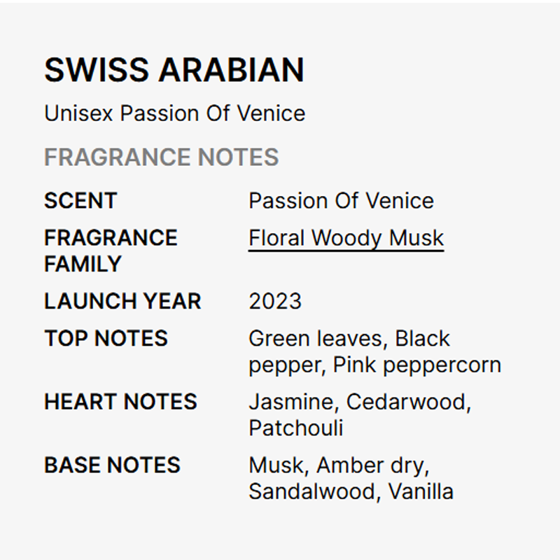 Swiss Arabian, a prestigious design house based in the United Arab Emirates, is known for its luxurious and sophisticated fragrances. Passion Of Venice is a testament to their expertise in creating scents that are both unique and alluring. This fragrance, with its intricate blend of floral, woody, and musky notes, is a perfect representation of the brand’s dedication to quality and elegance.